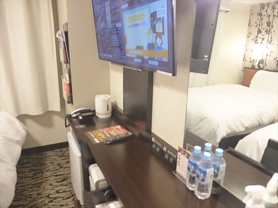 部屋が狭く感じるのはでかいベッドのせいですね、ベッドに全フリしてる部屋です。本当に寝るだけの部屋。スーツケースを広げたり、部屋内ですれ違うのも難しいぐらい空間が狭い。